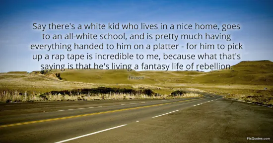 Eminem. "Say there's a white kid who lives in a nice home, goes to an all-white school, and is pretty much having everything handed to him on a platter - for him to pick up a rap tape is incredible to me, because what that's saying is that he's living a fantasy life of rebellion." FixQuotes. January 18, 2026. https://fixquotes.com/quotes/say-theres-a-white-kid-who-lives-in-a-nice-home-23507/.