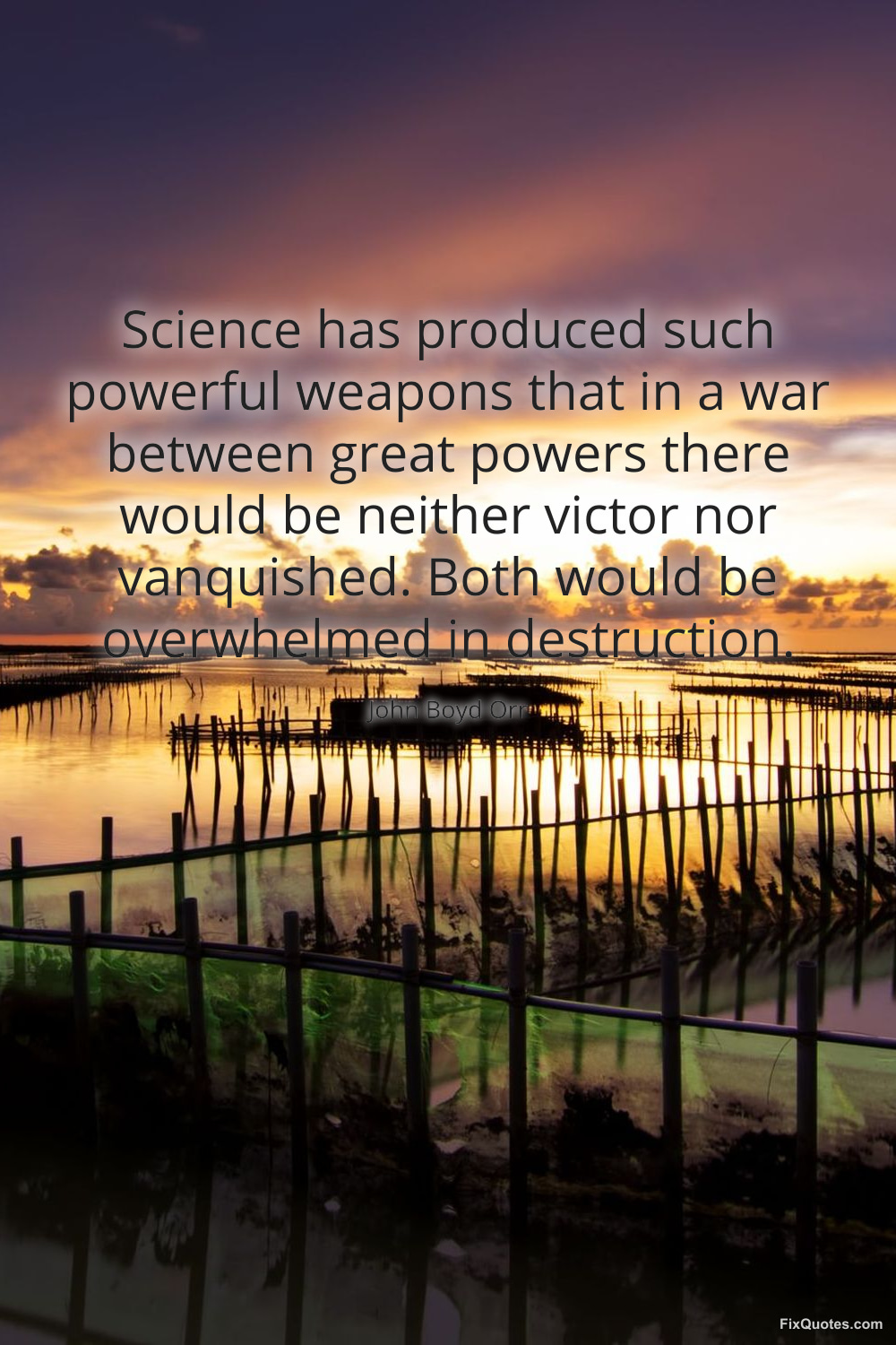 Orr, John Boyd. (2026, March 31). Science has produced such powerful weapons that in a war between great powers there would be neither victor nor vanquished. Both would be overwhelmed in destruction. FixQuotes. https://fixquotes.com/quotes/science-has-produced-such-powerful-weapons-that-74933/