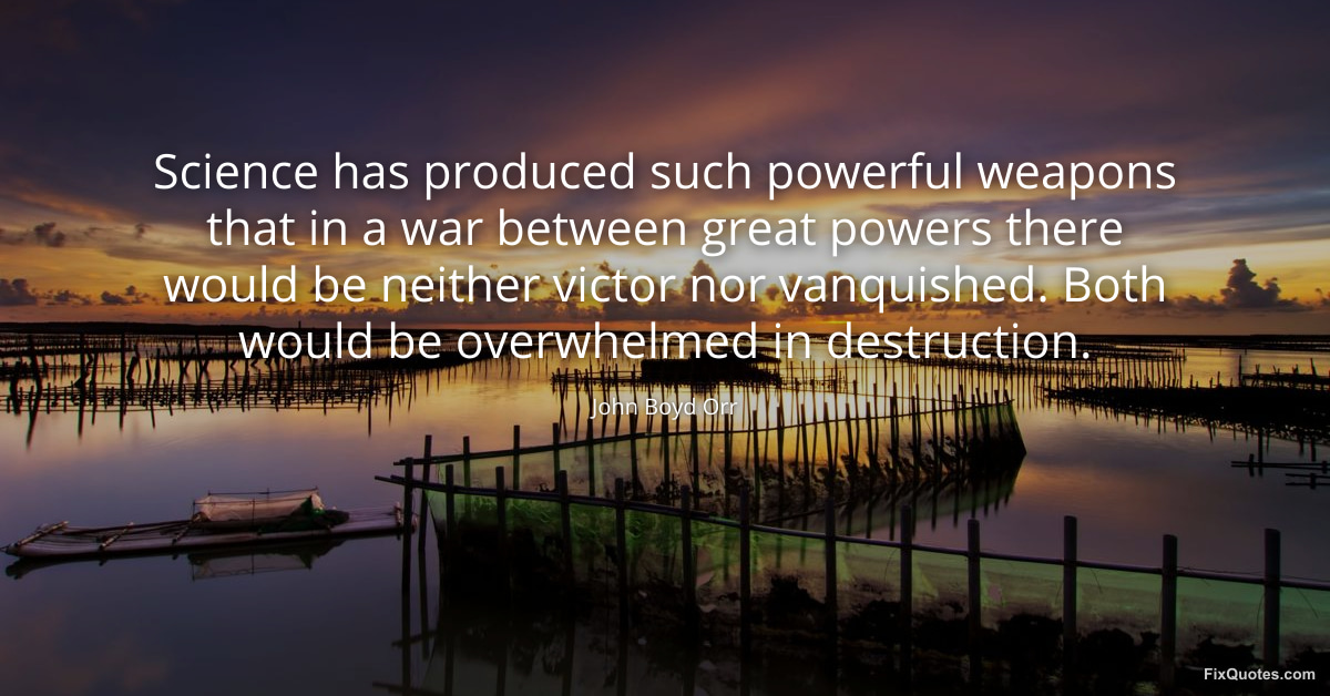 Orr, John Boyd. "Science has produced such powerful weapons that in a war between great powers there would be neither victor nor vanquished. Both would be overwhelmed in destruction." FixQuotes. March 31, 2026. https://fixquotes.com/quotes/science-has-produced-such-powerful-weapons-that-74933/.