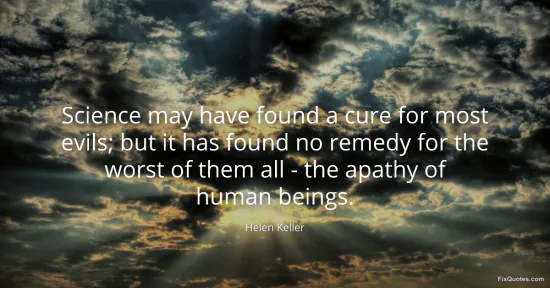 Keller, Helen. (2026, January 18). Science may have found a cure for most evils; but it has found no remedy for the worst of them all - the apathy of human beings. FixQuotes. https://fixquotes.com/quotes/science-may-have-found-a-cure-for-most-evils-but-14115/