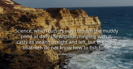 Herzen, Alexander. (2026, January 15). Science, which cuts its way through the muddy pond of daily life without mingling with it, casts its wealth to right and left, but the puny boatmen do not know how to fish for it. FixQuotes. https://fixquotes.com/quotes/science-which-cuts-its-way-through-the-muddy-pond-35899/