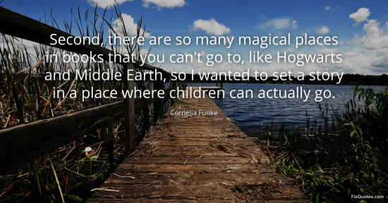 Funke, Cornelia. (2026, January 17). Second, there are so many magical places in books that you can't go to, like Hogwarts and Middle Earth, so I wanted to set a story in a place where children can actually go. FixQuotes. https://fixquotes.com/quotes/second-there-are-so-many-magical-places-in-books-53604/