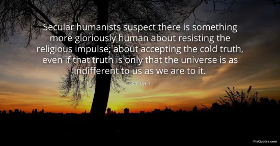 Flynn, Tom. "Secular humanists suspect there is something more gloriously human about resisting the religious impulse; about accepting the cold truth, even if that truth is only that the universe is as indifferent to us as we are to it." FixQuotes. January 15, 2026. https://fixquotes.com/quotes/secular-humanists-suspect-there-is-something-more-160902/.