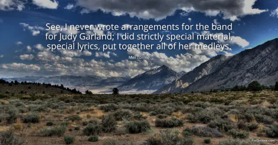 Torme, Mel. "See, I never wrote arrangements for the band for Judy Garland; I did strictly special material, special lyrics, put together all of her medleys." FixQuotes. January 17, 2026. https://fixquotes.com/quotes/see-i-never-wrote-arrangements-for-the-band-for-79998/.