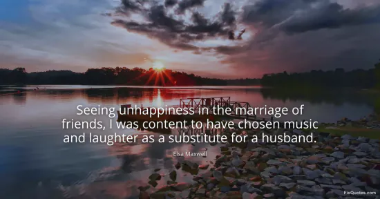 Maxwell, Elsa. "Seeing unhappiness in the marriage of friends, I was content to have chosen music and laughter as a substitute for a husband." FixQuotes. January 15, 2026. https://fixquotes.com/quotes/seeing-unhappiness-in-the-marriage-of-friends-i-141320/.