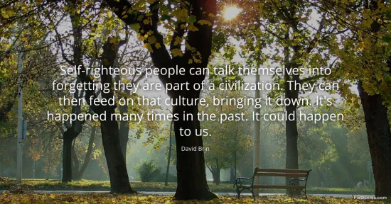 Brin, David. "Self-righteous people can talk themselves into forgetting they are part of a civilization. They can then feed on that culture, bringing it down. It's happened many times in the past. It could happen to us." FixQuotes. January 17, 2026. https://fixquotes.com/quotes/self-righteous-people-can-talk-themselves-into-42803/.