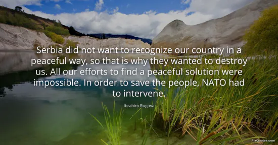 Rugova, Ibrahim. "Serbia did not want to recognize our country in a peaceful way, so that is why they wanted to destroy us. All our efforts to find a peaceful solution were impossible. In order to save the people, NATO had to intervene." FixQuotes. January 15, 2026. https://fixquotes.com/quotes/serbia-did-not-want-to-recognize-our-country-in-a-146663/.