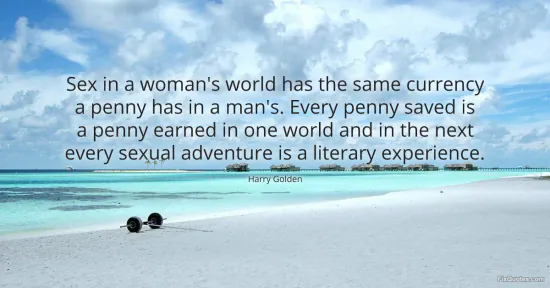 Golden, Harry. (2026, January 16). Sex in a woman's world has the same currency a penny has in a man's. Every penny saved is a penny earned in one world and in the next every sexual adventure is a literary experience. FixQuotes. https://fixquotes.com/quotes/sex-in-a-womans-world-has-the-same-currency-a-136914/