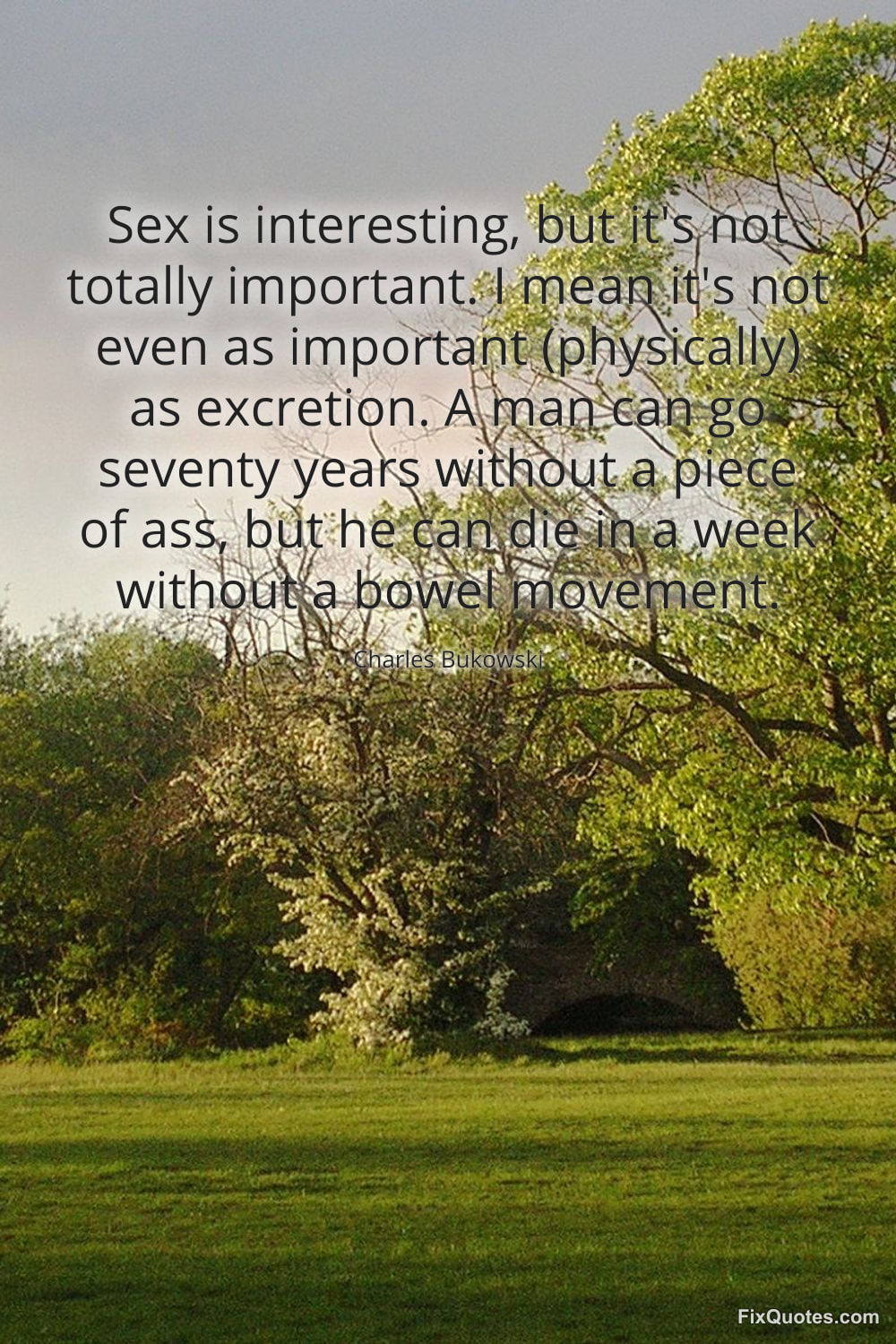 Bukowski, Charles. (2026, February 10). Sex is interesting, but it's not totally important. I mean it's not even as important (physically) as excretion. A man can go seventy years without a piece of ass, but he can die in a week without a bowel movement. FixQuotes. https://fixquotes.com/quotes/sex-is-interesting-but-its-not-totally-important-185162/