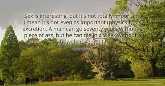 "Sex is interesting, but it's not totally important. I mean it's not even as important (physically) as excretion. A man can go seventy years without a piece of ass, but he can die in a week without a bowel movement." FixQuotes, 10 Feb. 2026, https://fixquotes.com/quotes/sex-is-interesting-but-its-not-totally-important-185162/. Accessed 12 Feb. 2026.