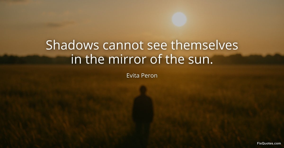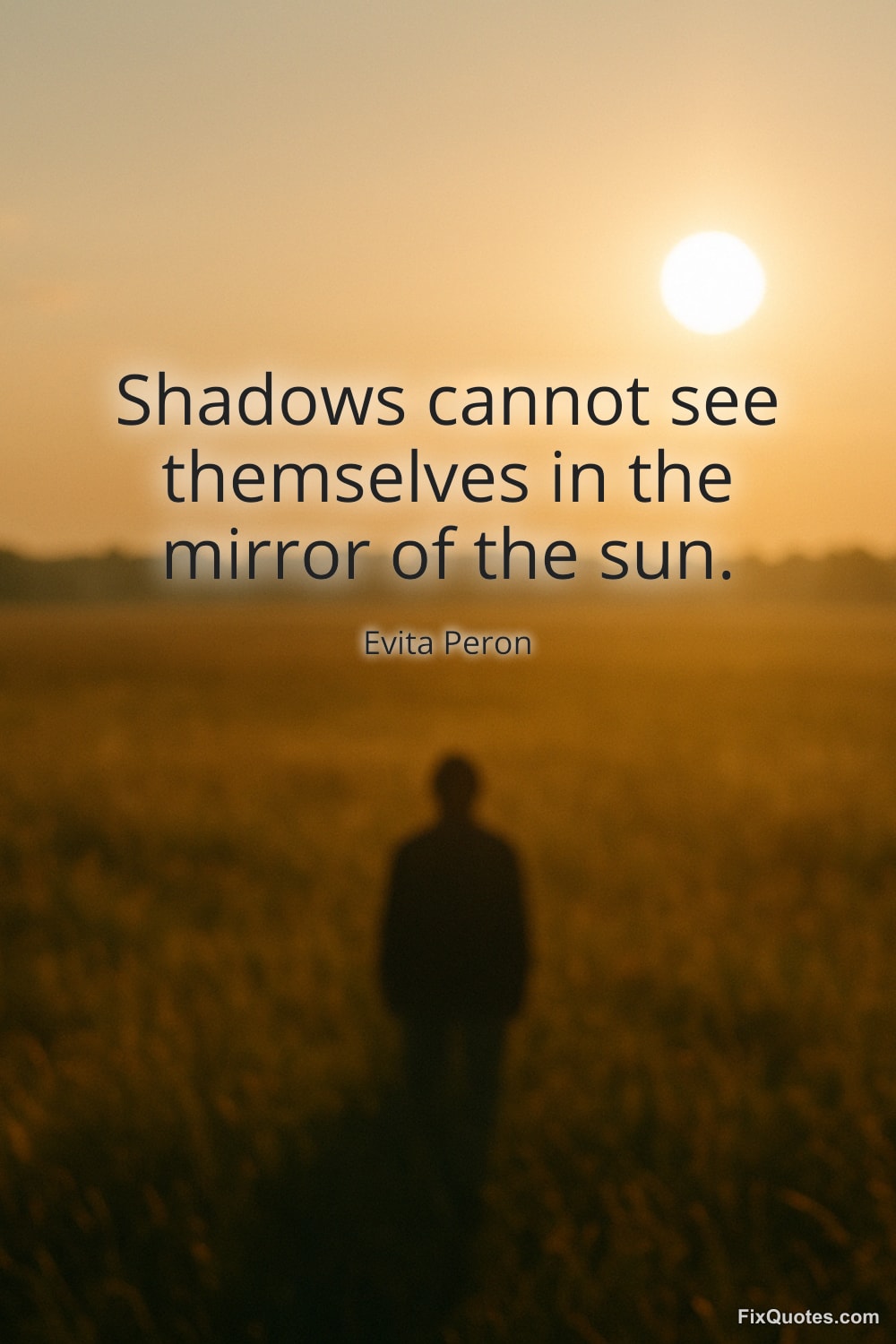 Peron, Evita. "Shadows cannot see themselves in the mirror of the sun." FixQuotes. January 29, 2026. https://fixquotes.com/quotes/shadows-cannot-see-themselves-in-the-mirror-of-148141/.