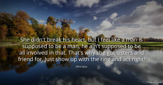 Epps, Mike. (2026, February 17). She didn't break his heart, but I feel like a man is supposed to be a man, he ain't supposed to be all involved in that. That's why she got sisters and friend for. Just show up with the ring and act right! FixQuotes. https://fixquotes.com/quotes/she-didnt-break-his-heart-but-i-feel-like-a-man-156865/