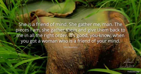 Morrison, Toni. (2026, February 8). She is a friend of mind. She gather me, man. The pieces I am, she gather them and give them back to me in all the right order. It's good, you know, when you got a woman who is a friend of your mind. FixQuotes. https://fixquotes.com/quotes/she-is-a-friend-of-mind-she-gather-me-man-the-160089/