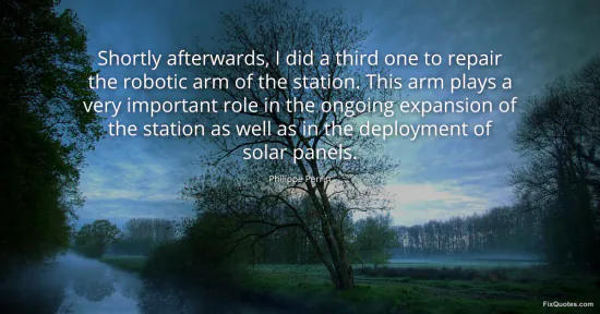 Perrin, Philippe. (2026, January 17). Shortly afterwards, I did a third one to repair the robotic arm of the station. This arm plays a very important role in the ongoing expansion of the station as well as in the deployment of solar panels. FixQuotes. https://fixquotes.com/quotes/shortly-afterwards-i-did-a-third-one-to-repair-75010/