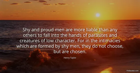 Taylor, Henry. "Shy and proud men are more liable than any others to fall into the hands of parasites and creatures of low character. For in the intimacies which are formed by shy men, they do not choose, but are chosen." FixQuotes. January 16, 2026. https://fixquotes.com/quotes/shy-and-proud-men-are-more-liable-than-any-others-135600/.