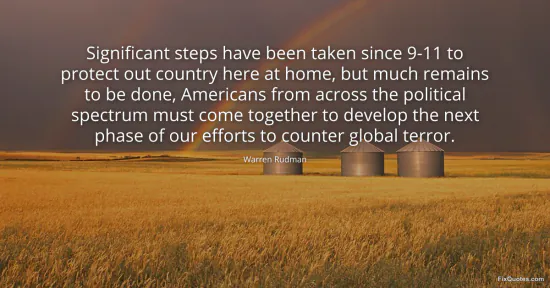 Rudman, Warren. "Significant steps have been taken since 9-11 to protect out country here at home, but much remains to be done, Americans from across the political spectrum must come together to develop the next phase of our efforts to counter global terror." FixQuotes. January 16, 2026. https://fixquotes.com/quotes/significant-steps-have-been-taken-since-9-11-to-120953/.
