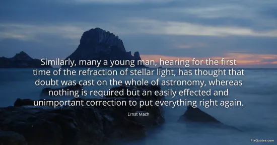 Mach, Ernst. "Similarly, many a young man, hearing for the first time of the refraction of stellar light, has thought that doubt was cast on the whole of astronomy, whereas nothing is required but an easily effected and unimportant correction to put everything right again." FixQuotes. January 17, 2026. https://fixquotes.com/quotes/similarly-many-a-young-man-hearing-for-the-first-66688/.