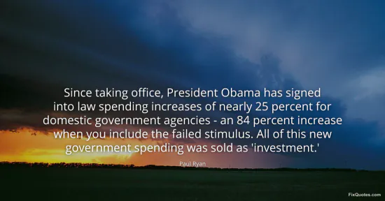 Ryan, Paul. (2026, January 15). Since taking office, President Obama has signed into law spending increases of nearly 25 percent for domestic government agencies - an 84 percent increase when you include the failed stimulus. All of this new government spending was sold as 'investment.'. FixQuotes. https://fixquotes.com/quotes/since-taking-office-president-obama-has-signed-163657/