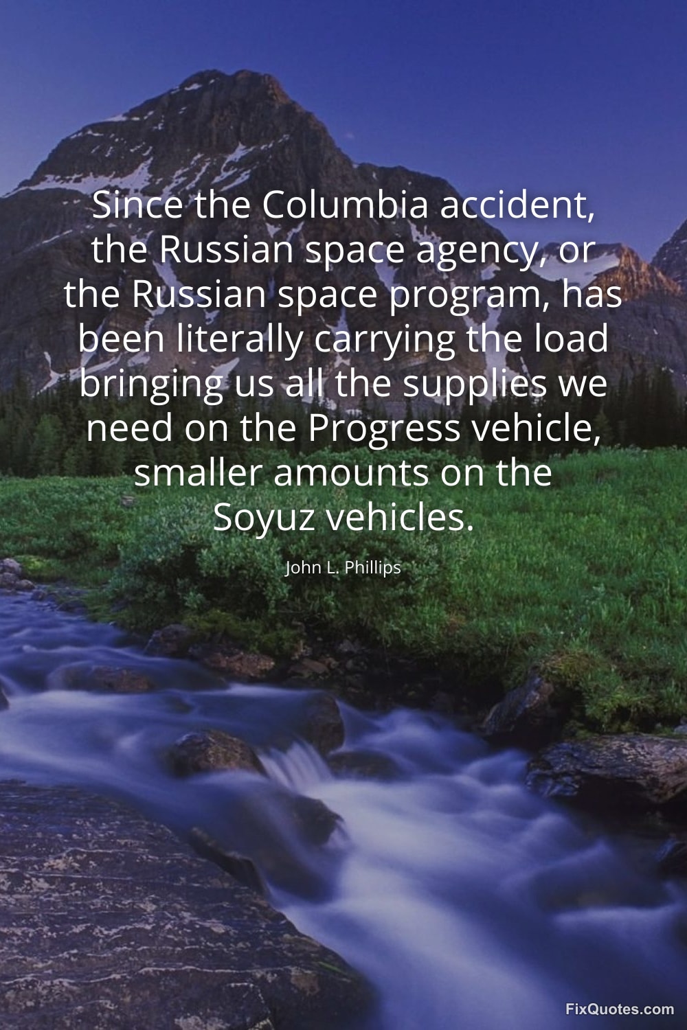 Phillips, John L. "Since the Columbia accident, the Russian space agency, or the Russian space program, has been literally carrying the load bringing us all the supplies we need on the Progress vehicle, smaller amounts on the Soyuz vehicles." FixQuotes. January 17, 2026. https://fixquotes.com/quotes/since-the-columbia-accident-the-russian-space-60883/.