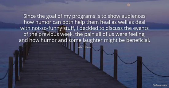 Klein, Allen. (2026, January 17). Since the goal of my programs is to show audiences how humor can both help them heal as well as deal with not-so-funny stuff, I decided to discuss the events of the previous week, the pain all of us were feeling, and how humor and some laughter might be beneficial. FixQuotes. https://fixquotes.com/quotes/since-the-goal-of-my-programs-is-to-show-62264/