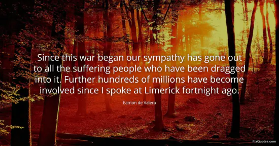 Valera, Eamon de. (2026, January 17). Since this war began our sympathy has gone out to all the suffering people who have been dragged into it. Further hundreds of millions have become involved since I spoke at Limerick fortnight ago. FixQuotes. https://fixquotes.com/quotes/since-this-war-began-our-sympathy-has-gone-out-to-47461/