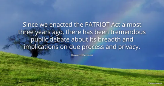 Berman, Howard. (2026, January 17). Since we enacted the PATRIOT Act almost three years ago, there has been tremendous public debate about its breadth and implications on due process and privacy. FixQuotes. https://fixquotes.com/quotes/since-we-enacted-the-patriot-act-almost-three-73723/