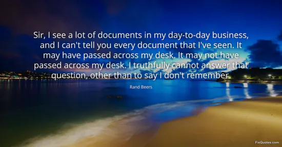 Beers, Rand. "Sir, I see a lot of documents in my day-to-day business, and I can't tell you every document that I've seen. It may have passed across my desk. It may not have passed across my desk. I truthfully cannot answer that question, other than to say I don't remember." FixQuotes. January 16, 2026. https://fixquotes.com/quotes/sir-i-see-a-lot-of-documents-in-my-day-to-day-82828/.