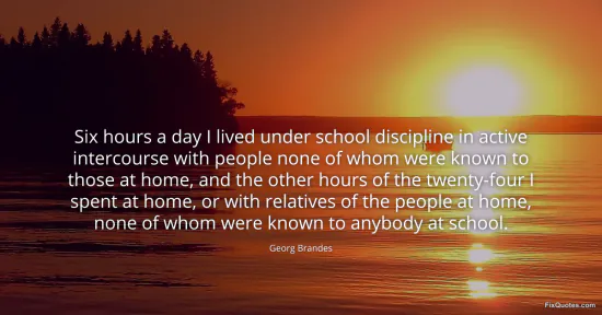 Brandes, Georg. "Six hours a day I lived under school discipline in active intercourse with people none of whom were known to those at home, and the other hours of the twenty-four I spent at home, or with relatives of the people at home, none of whom were known to anybody at school." FixQuotes. January 17, 2026. https://fixquotes.com/quotes/six-hours-a-day-i-lived-under-school-discipline-74287/.