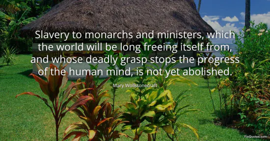 Wollstonecraft, Mary. "Slavery to monarchs and ministers, which the world will be long freeing itself from, and whose deadly grasp stops the progress of the human mind, is not yet abolished." FixQuotes. January 14, 2026. https://fixquotes.com/quotes/slavery-to-monarchs-and-ministers-which-the-world-7502/.