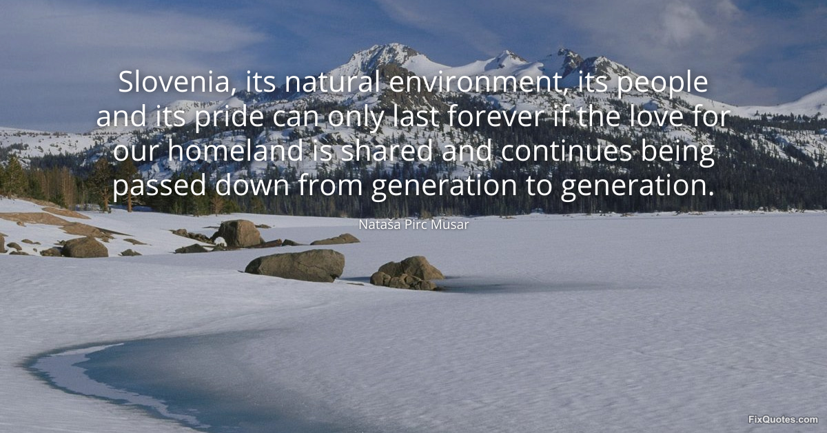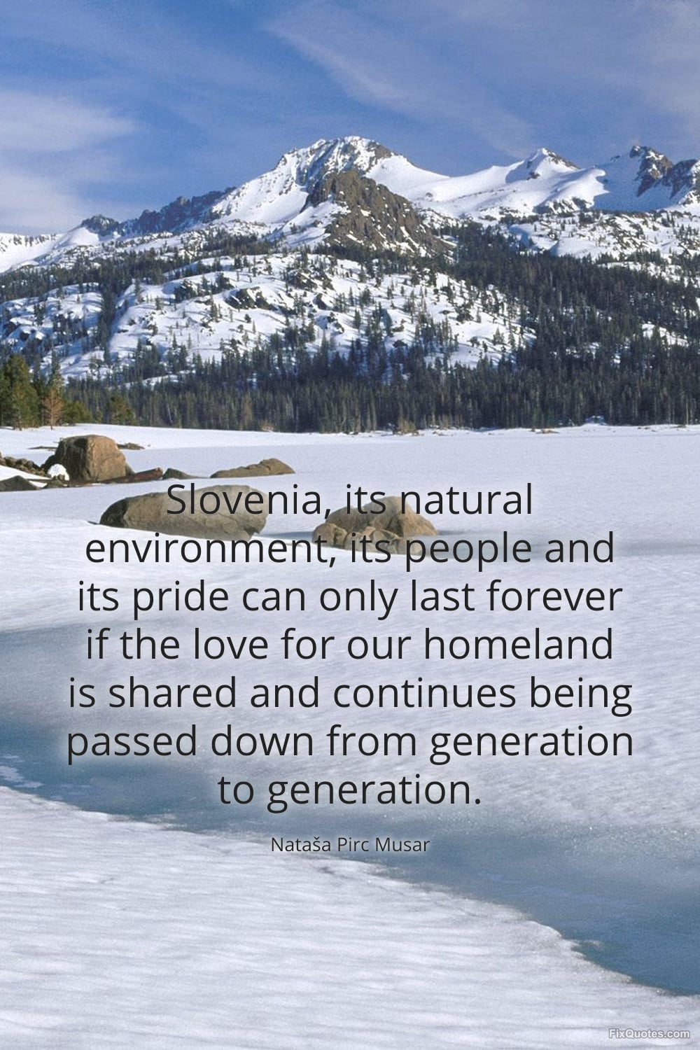 Musar, Nataša Pirc. (2026, February 18). Slovenia, its natural environment, its people and its pride can only last forever if the love for our homeland is shared and continues being passed down from generation to generation. FixQuotes. https://fixquotes.com/quotes/slovenia-its-natural-environment-its-people-and-185637/