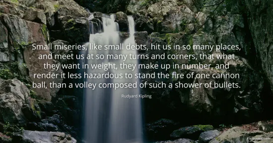 Kipling understands a truth that sounds unheroic, which is precisely why it lands: the things that wear us down are rarely dramatic. He frames “small miseries” as a kind of guerrilla warfare against the psyche, ambushing us “at so many turns and corners.” The sentence moves like the experience it describes - piling clause upon clause, refusing the clean release a single catastrophe would offer. You can brace for a cannon ball. You can narrativize it. A “shower of bullets” denies you that dignity.