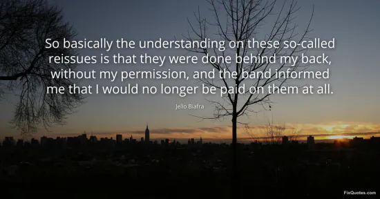 Biafra, Jello. "So basically the understanding on these so-called reissues is that they were done behind my back, without my permission, and the band informed me that I would no longer be paid on them at all." FixQuotes. January 15, 2026. https://fixquotes.com/quotes/so-basically-the-understanding-on-these-so-called-149260/.