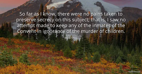 Monk, Maria. "So far as I know, there were no pains taken to preserve secrecy on this subject; that is, I saw no attempt made to keep any of the inmates of the Convent in ignorance of the murder of children." FixQuotes. January 15, 2026. https://fixquotes.com/quotes/so-far-as-i-know-there-were-no-pains-taken-to-150807/.