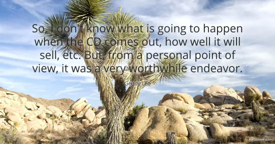 "So, I don't know what is going to happen when the CD comes out, how well it will sell, etc. But, from a personal point of view, it was a very worthwhile endeavor." FixQuotes, 17 Jan. 2026, https://fixquotes.com/quotes/so-i-dont-know-what-is-going-to-happen-when-the-53391/. Accessed 12 Feb. 2026.