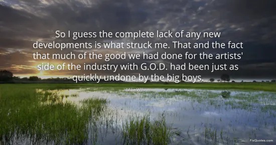 Wilson, Mike. "So I guess the complete lack of any new developments is what struck me. That and the fact that much of the good we had done for the artists' side of the industry with G.O.D. had been just as quickly undone by the big boys." FixQuotes. January 16, 2026. https://fixquotes.com/quotes/so-i-guess-the-complete-lack-of-any-new-88424/.