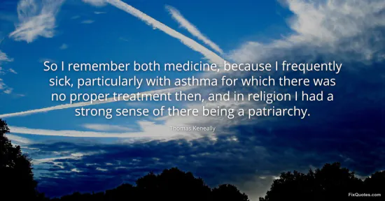Keneally, Thomas. "So I remember both medicine, because I frequently sick, particularly with asthma for which there was no proper treatment then, and in religion I had a strong sense of there being a patriarchy." FixQuotes. January 16, 2026. https://fixquotes.com/quotes/so-i-remember-both-medicine-because-i-frequently-89566/.