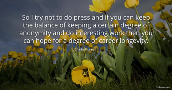 Hunnam, Charlie. (2026, January 17). So I try not to do press and if you can keep the balance of keeping a certain degree of anonymity and do interesting work then you can hope for a degree of career longevity. FixQuotes. https://fixquotes.com/quotes/so-i-try-not-to-do-press-and-if-you-can-keep-the-48814/