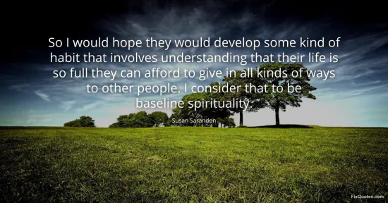 Sarandon, Susan. "So I would hope they would develop some kind of habit that involves understanding that their life is so full they can afford to give in all kinds of ways to other people. I consider that to be baseline spirituality." FixQuotes. January 16, 2026. https://fixquotes.com/quotes/so-i-would-hope-they-would-develop-some-kind-of-131052/.