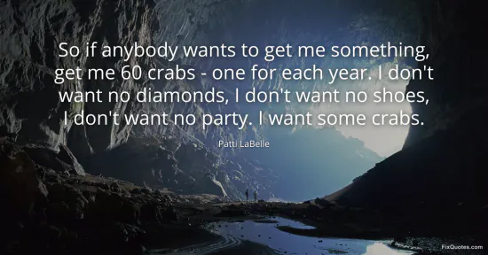 LaBelle, Patti. (2026, January 15). So if anybody wants to get me something, get me 60 crabs - one for each year. I don't want no diamonds, I don't want no shoes, I don't want no party. I want some crabs. FixQuotes. https://fixquotes.com/quotes/so-if-anybody-wants-to-get-me-something-get-me-60-151136/