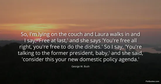 Bush, George W. "So, I'm lying on the couch and Laura walks in and I say, 'Free at last,' and she says 'You're free all right, you're free to do the dishes.' So I say, 'You're talking to the former president, baby,' and she said, 'consider this your new domestic policy agenda.'." FixQuotes. January 18, 2026. https://fixquotes.com/quotes/so-im-lying-on-the-couch-and-laura-walks-in-and-i-7288/.