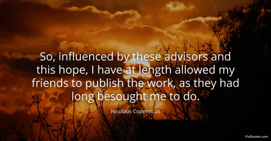 Copernicus, Nicolaus. (2026, January 18). So, influenced by these advisors and this hope, I have at length allowed my friends to publish the work, as they had long besought me to do. FixQuotes. https://fixquotes.com/quotes/so-influenced-by-these-advisors-and-this-hope-i-11389/