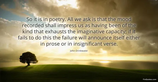 Drinkwater, John. "So it is in poetry. All we ask is that the mood recorded shall impress us as having been of the kind that exhausts the imaginative capacity; if it fails to do this the failure will announce itself either in prose or in insignificant verse." FixQuotes. January 16, 2026. https://fixquotes.com/quotes/so-it-is-in-poetry-all-we-ask-is-that-the-mood-114148/.
