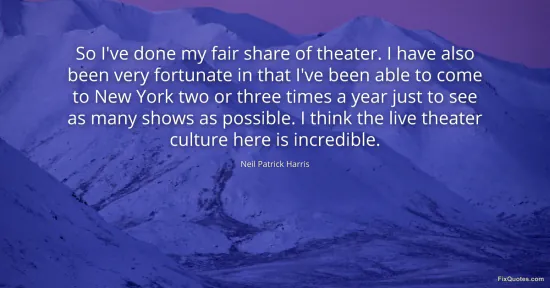 Harris, Neil Patrick. (2026, January 16). So I've done my fair share of theater. I have also been very fortunate in that I've been able to come to New York two or three times a year just to see as many shows as possible. I think the live theater culture here is incredible. FixQuotes. https://fixquotes.com/quotes/so-ive-done-my-fair-share-of-theater-i-have-also-117215/