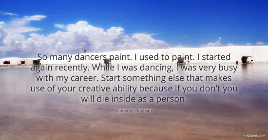 Dunham, Katherine. "So many dancers paint. I used to paint. I started again recently. While I was dancing, I was very busy with my career. Start something else that makes use of your creative ability because if you don't you will die inside as a person." FixQuotes. January 15, 2026. https://fixquotes.com/quotes/so-many-dancers-paint-i-used-to-paint-i-started-144268/.