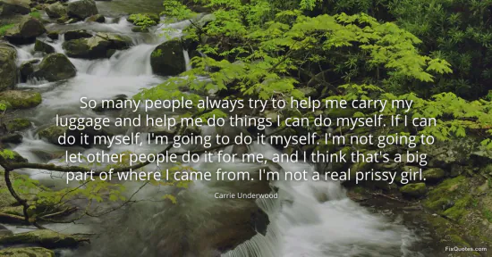 Underwood, Carrie. "So many people always try to help me carry my luggage and help me do things I can do myself. If I can do it myself, I'm going to do it myself. I'm not going to let other people do it for me, and I think that's a big part of where I came from. I'm not a real prissy girl." FixQuotes. January 15, 2026. https://fixquotes.com/quotes/so-many-people-always-try-to-help-me-carry-my-157901/.