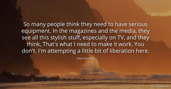 Schneider, Sally. (2026, January 15). So many people think they need to have serious equipment. In the magazines and the media, they see all this stylish stuff, especially on TV, and they think, That's what I need to make it work. You don't. I'm attempting a little bit of liberation here. FixQuotes. https://fixquotes.com/quotes/so-many-people-think-they-need-to-have-serious-149997/