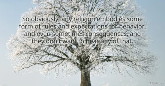 "So obviously, any religion embodies some form of rules and expectations for behavior, and even sometimes consequences, and they don't want to hear any of that." FixQuotes, 16 Jan. 2026, https://fixquotes.com/quotes/so-obviously-any-religion-embodies-some-form-of-93794/. Accessed 21 Feb. 2026.