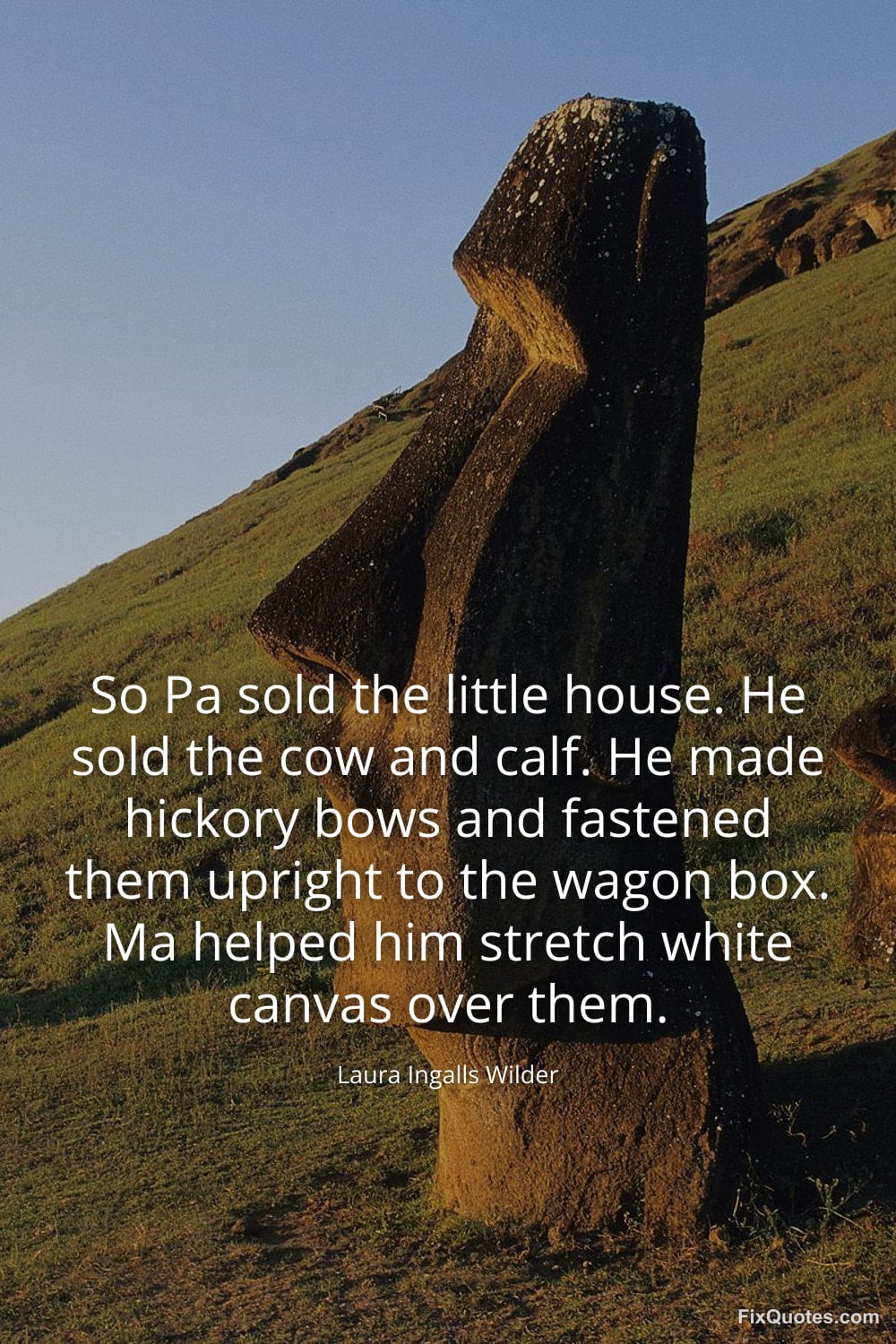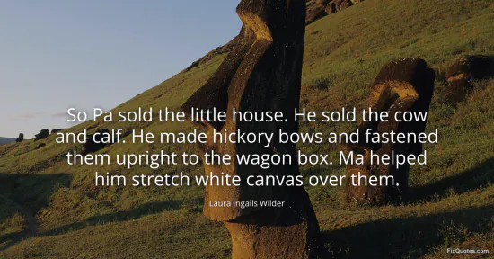 Wilder, Laura Ingalls. "So Pa sold the little house. He sold the cow and calf. He made hickory bows and fastened them upright to the wagon box. Ma helped him stretch white canvas over them." FixQuotes. January 15, 2026. https://fixquotes.com/quotes/so-pa-sold-the-little-house-he-sold-the-cow-and-156546/.
