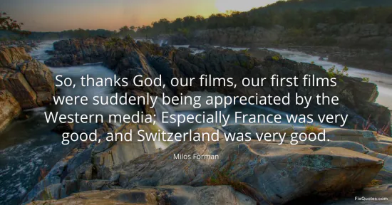 Forman, Milos. (2026, February 18). So, thanks God, our films, our first films were suddenly being appreciated by the Western media; Especially France was very good, and Switzerland was very good. FixQuotes. https://fixquotes.com/quotes/so-thanks-god-our-films-our-first-films-were-89655/