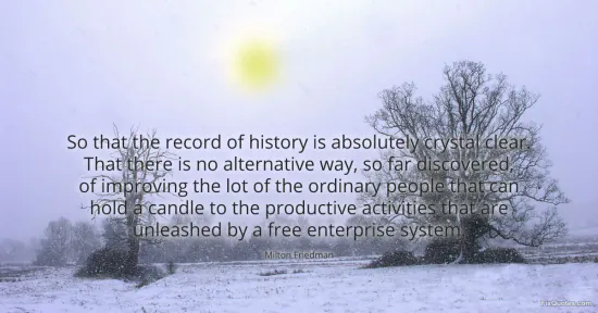 Friedman, Milton. (2026, January 18). So that the record of history is absolutely crystal clear. That there is no alternative way, so far discovered, of improving the lot of the ordinary people that can hold a candle to the productive activities that are unleashed by a free enterprise system. FixQuotes. https://fixquotes.com/quotes/so-that-the-record-of-history-is-absolutely-20283/
